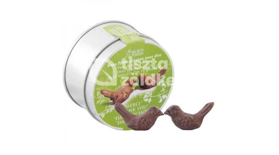 2 db öntöttvas madár dísz fém dobozban, a dobozon Thank you felirattal.