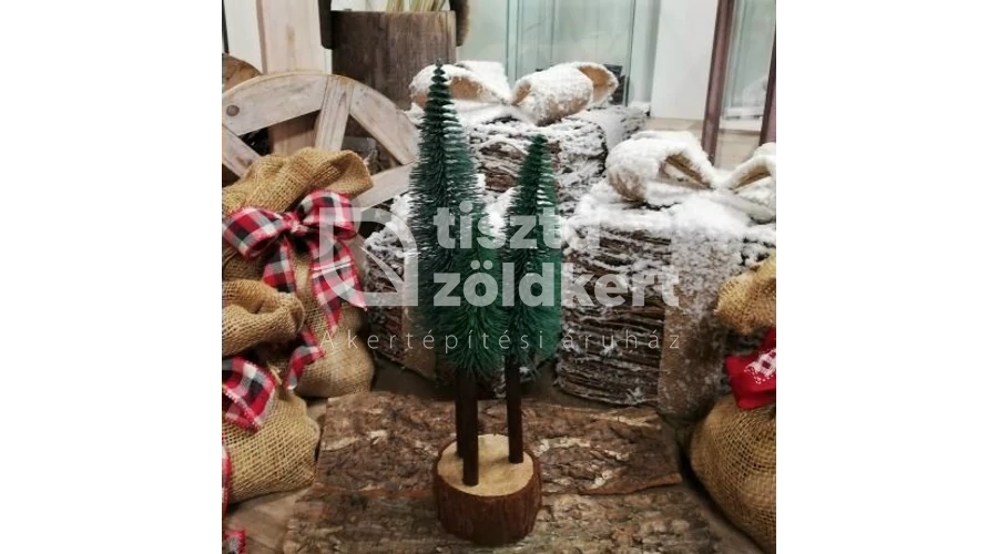 Sötétzöld műanyag fenyők mini farönk alapon.