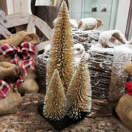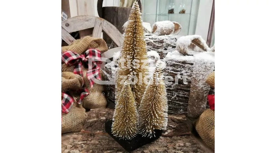 Arany műanyag dekortációs fenyők szögletes fa tálon.