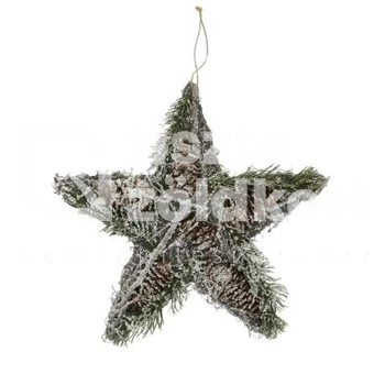 Csillag formájú akasztható karácsonyi dísz ágakkal és tobozokkal.Havas.