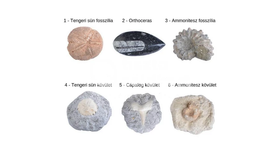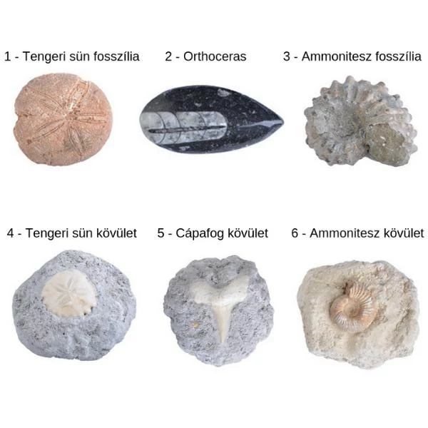 Kövületek dobozban. Tengeri sün kövület, cápafog kövület, ammonitesz fosszília, ammonitesz kövület, orthoceras és tengeri sün fosszília díszdobozban. Remek ajándékötlet gyűjtök, gyermekek és a a ritka dísztárgyak kedvelői számára.