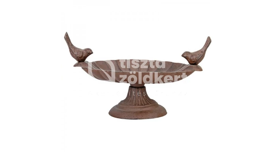 Öntöttvas madáretető talpon, barna színben, a szélén két madár dísszel.