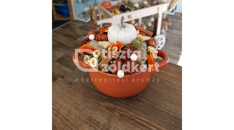 Cserépedényes őszi asztali dekoráció-rozsdabarna